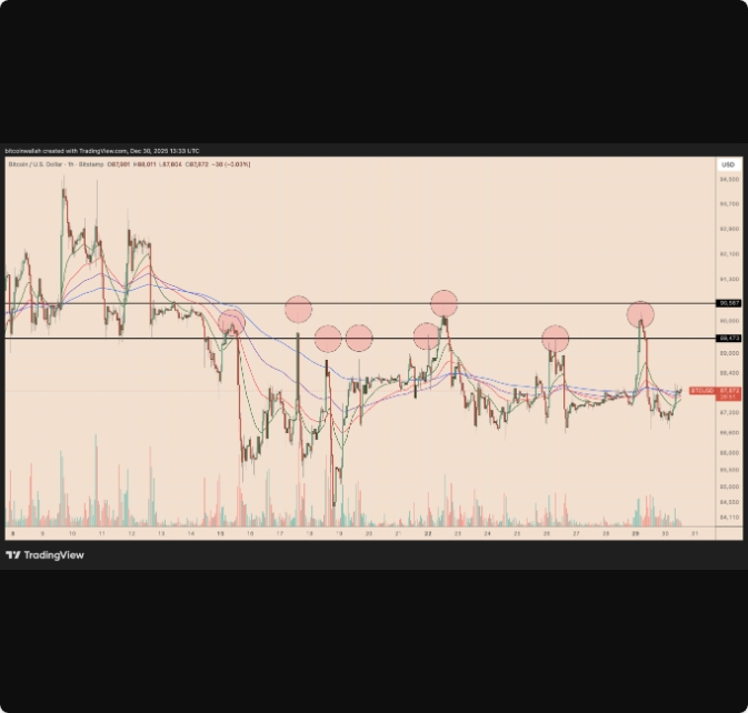 • در دسامبر، قیمت بیت کوین نتوانست از مرز ۹۰٬۰۰۰ دلار عبور کند و هر بار تلاش برای شکست این سطح، با ریزش شدید به سمت ناحیه ۸۵٬۰۰۰ تا ۸۷٬۰۰۰ دلار مواجه شد.